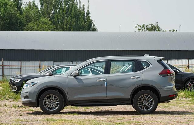 再来看车身侧面部分,奇骏的车身侧面展现出日系SUV特有的实用美学,4681mm的车长与2706mm轴距构成黄金比例,配合1840mm的宽体车身,营造出修长而稳重的视觉姿态。U-Shape双腰线设计如雕刻般贯穿车身,前段凌厉后段柔和的转折处理,既凸显肌肉感又避免线条呆板。悬浮式车顶通过镀铬饰条与黑色立柱的巧妙搭配实现,而19英寸双五辐切削轮毂则进一步强化运动属性